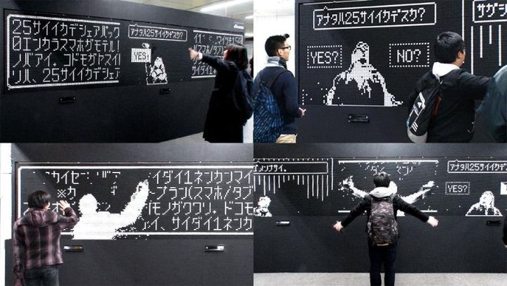 「ドコモの学割 Flip-Dot」とは 1枚のドットがコイン1枚ほどの大きさの円盤を2万5千枚敷き詰めた、幅6m×高さ1mのドット型大型広告で、デジタルプログラムによって円盤一枚一枚が回転し、文字やアニメーションを表現します。2017年3月に、NTTドコモ「学割キャンペーン」のプロモーションの一環としてJR秋葉原駅に設置されました。人通りの多い駅構内で、ドットが回転する時の爽快な風切り音が通行人の足を止め、またカメラを使ったインタラクティブな演出も人々を楽しませました。