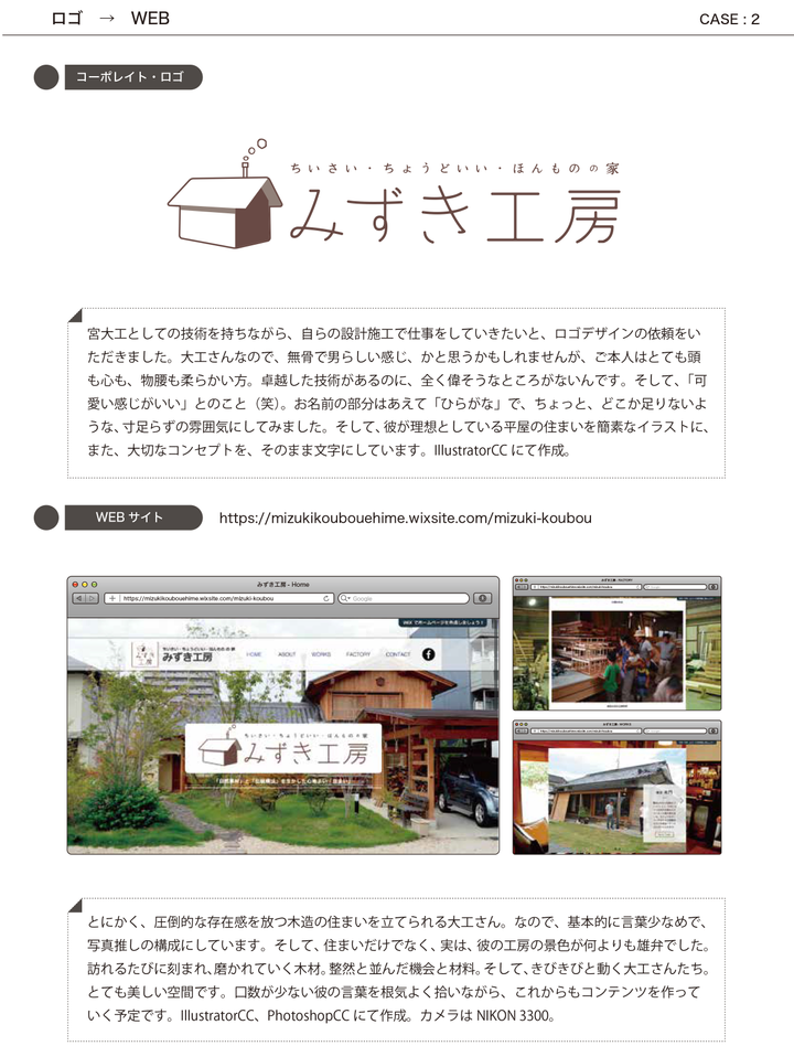 【ロゴ】 宮大工としての技術を持ちながら、自らの設計施工で仕事をしていきたいと、ロゴデザインの依頼をいただきました。大工さんなので、無骨で男らしい感じ、かと思うかもしれませんが、ご本人はとても頭も心も、物腰も柔らかい方。卓越した技術があるのに、全く偉そうなところがないんです。そして、「可愛い感じがいい」とのこと(笑)。お名前の部分はあえて「ひらがな」で、ちょっと、どこか足りないような、寸足らずの雰囲気にしてみました。そして、彼が理想としている平屋の住まいを簡素なイラストに、また、大切なコンセプトを、そのまま文字にしています。IllustratorCCにて作成。 【WEB】 とにかく、圧倒的な存在感を放つ木造の住まいを立てられる大工さん。なので、基本的に言葉少なめで、写真推しの構成にしています。そして、住まいだけでなく、実は、彼の工房の景色が何よりも雄弁でした。訪れるたびに刻まれ、磨かれていく木材。整然と並んだ機会と材料。そして、きびきびと動く大工さんたち。とても美しい空間です。口数が少ない彼の言葉を根気よく拾いながら、これからもコンテンツを作っていく予定です。IllustratorCC、PhotoshopCCにて作成。カメラはNIKON 3300。