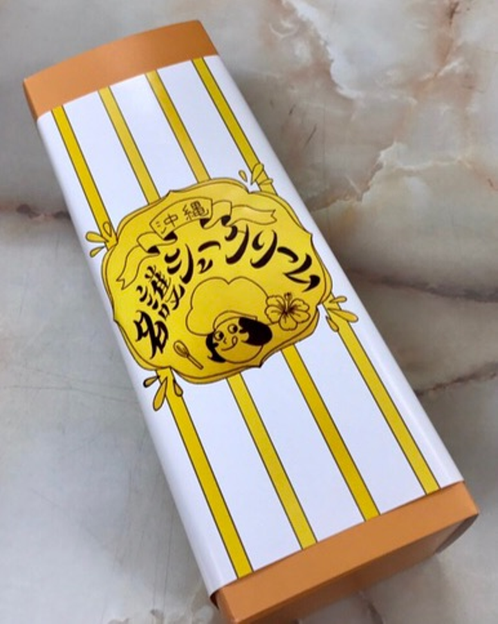 シュークリームの入った箱に巻く、巻紙のデザインです。クライアントの「沖縄らしいレトロなデザインで」といった要望を重視しつつ、自分の色彩感覚で沖縄をイメージした黄色をメインに描きました。 また、シュークリームそのもののふわっとしたイメージと、昔ながらのレトロな雰囲気を掛け合わせて文字のデザインを考案しました。