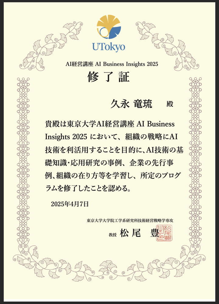 東京大学AI経営講座 AI Business Insights 2025 修了