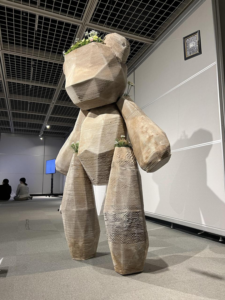 海洋プラスチックごみで出来た2Mの巨大くまです。 大型3Dプリンターの会社(ExtraBold)にインターンシップに参加し、海洋プラスチックごみの素材を開発、その素材を使ってこちらのくまと植木鉢を制作しました。 2023年10月4日に、実験内容について今治コンソーシアムで発表させていただきました。