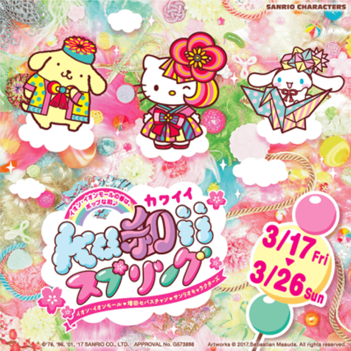 ka和ii カワイイ スプリングフェスティバル 2017年3/17-26まで関東のイオン・イオンモールで開催したイオン×サンリオ×アソビシステムズのコラボキャンペーン キーヴィジュアル制作、キャラクター&ロゴのディレクションを増田セバスチャン氏へ依頼。 和×Kawaiiというテーマにあわせてサンリオとのオリジナルグッツを開発。 サンリオキャラとコラボしたオリジナルグッズが当たる抽選会や ピューロランドのショーも各イオンモールで開催しました。 企画と製作進行管理を担当しました。