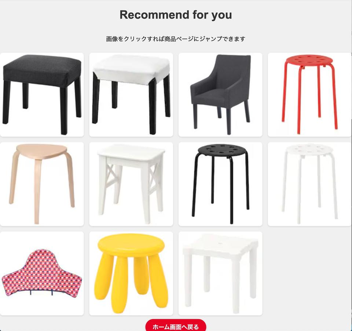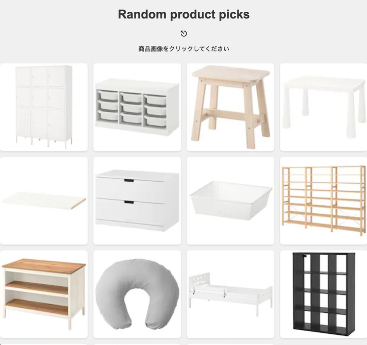 Kaggleにて公開されているIKEA Furniture datasetを使用してレコメンドアプリケーションを開発いたしました。 使用技術としてPython, Django, GitHub, HTML, CSS, JavaScriptを使用しています。 ~アプリケーション概要~ IKEAの家具で自分が好みの家具画像を選択し、選択された家具をもとにユーザーの好みに合う家具を推薦(レコメンデーション)するという内容のアプリケーションになっております。 ~使用している技術~ 開発において使用している技術は、 ・レコメンドシステム (コンテンツベースフィルタリング) ・Webスクレイピング(BeautifulSoup) Webスクレイピングに関しては、ユーザーが選択した商品画像をIKEA公式ページから取得する処理で使用しています。(今回使用したデータセットには商品画像のデータがない為) ~アプリケーションの公開について~ 公開に関して今後行う予定で進めています。 Web上での公開を考えているのですが、データセットやIKEA公式ページの画像の使用をしているので、それぞれの権利関係や利用規約などを調査中の為、公開はまだ行っておりません。