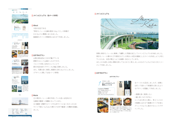 「乗客数を増やすにはどうしたらいいか」という課題に対しペルソナを設定して、Webからのアプローチを考えました。実際に東京モノレールにも乗車して沿線への取材も行い、東京モノレール様の担当者の方へ企画のプレゼンを行いました。企画立案から担当の方へのプレゼンまでの一連の流れを1人で行ったため、自分自身の企画をどう魅力的に伝えるか等の作成以外の部分でもとても勉強になりました。