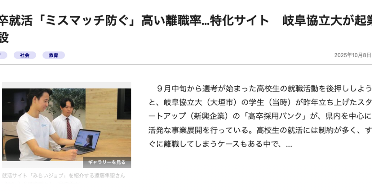 岐阜協立大学経営学部にて、ゼミで「少子高齢化社会における日本の労働・人材の未来とその在り方」をテーマに2年間研究し、論文を執筆。人口減少や人材不足が進む社会において、若者が主体的にキャリアを描ける環境の必要性を実感。この学びを原点に、高卒採用のミスマッチを解消し、18歳の可能性を最大化する事業を立ち上げるに至った。