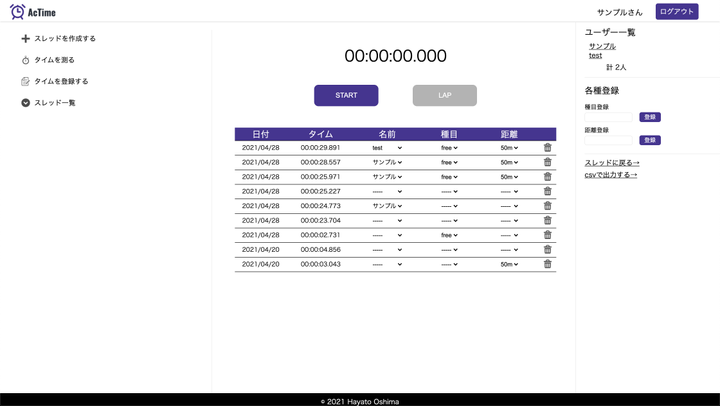タイムスポーツをするアスリートのためのタイム管理Webアプリ。アプリ内でタイム測定をすることができ、タイムには「誰」の何の「種目」で「距離」は何mなのか、という3つの情報を紐付けることができます。また、物理ストップウォッチで測定したタイムを登録することも可能です。スレッド機能を備え、スレッド内でメッセージのやりとりをすることも可能です。タイムはスレッド上で管理することで大会や合宿ごとに分けて管理することもできます。