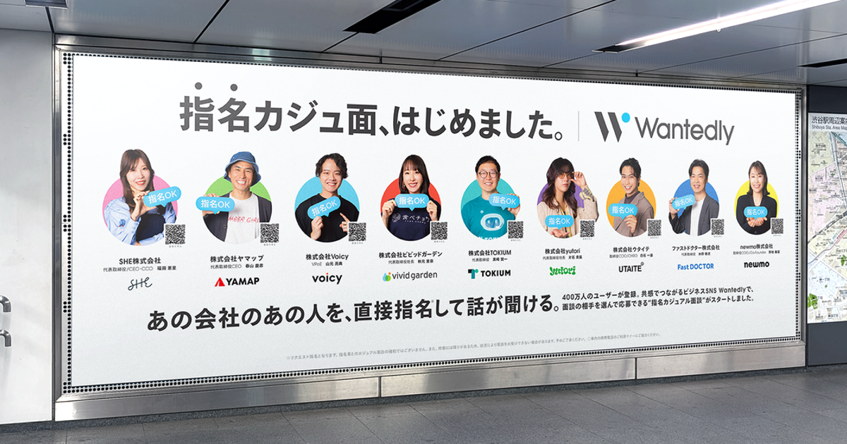 渋谷駅に大型ポスター出現!注目のスタートアップ9社の経営陣が「指名カジュ面、はじめました。」