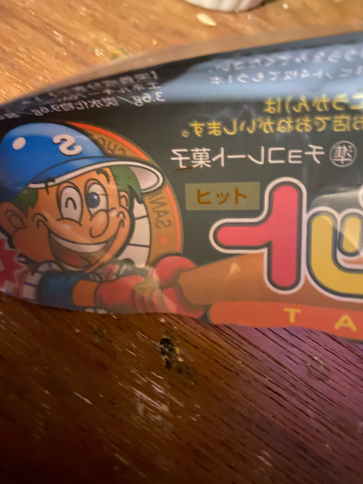 チョコバットのあいつのそばにヒットの文字が。どうやらヒット4本でチョコバットが一本貰えるらしい。あたりとはずれが表示されているタイプもあるがこのヒット表示は昔ながらの方のタイプだ。1ヶ月以上1日3本買い続けて試していたので裕に100本以上購入していることになる。これは1,000本ノックコースになるのだろうか。 子どもの時に当たるまで買い続けなくてよかったと感慨深い。