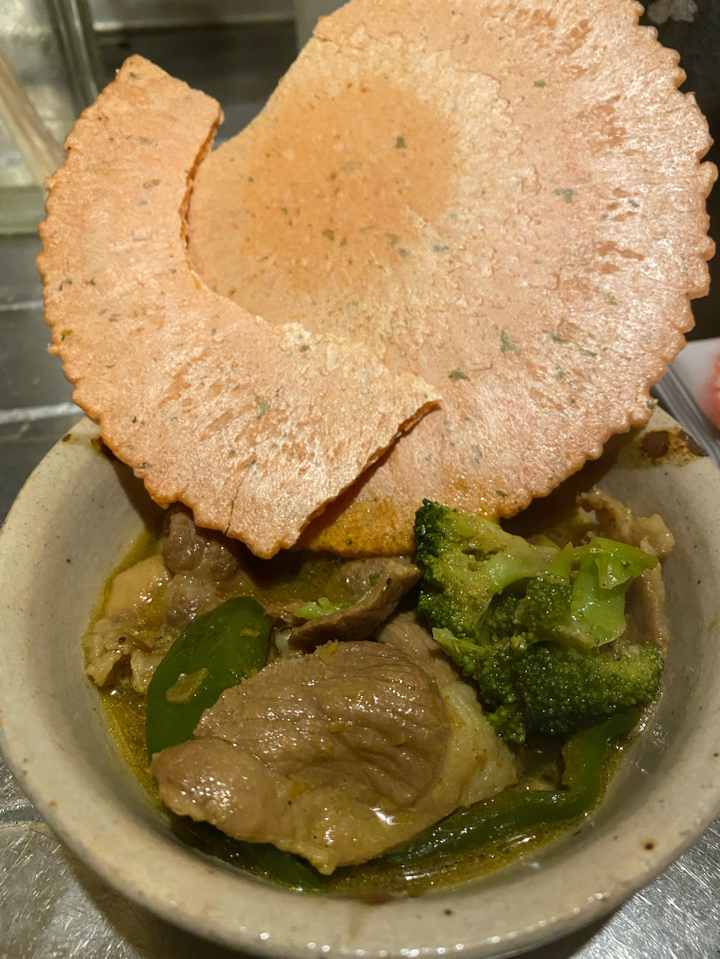 さっき八重洲の奥芝商店東京浪漫号に行ってきた。 それでえびせんが気になったので食材を集めてスープカレーを作成。出汁を海鮮にすると札幌風になるのだと思うがなかったので豚肉で作る。えびせんだけで海老のだし汁をつくるのは無理があるか。