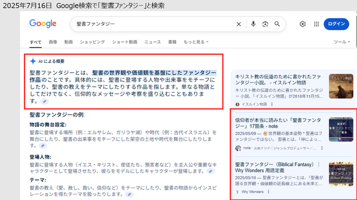 Google検索で「聖書ファンタジー(聖書 ファンタジー)」と検索したときに表示されるAIによる要約に、個人プロジェクトWry Wondersで公開した「聖書ファンタジー」の定義が採用されています。(2025年7月16日現在)