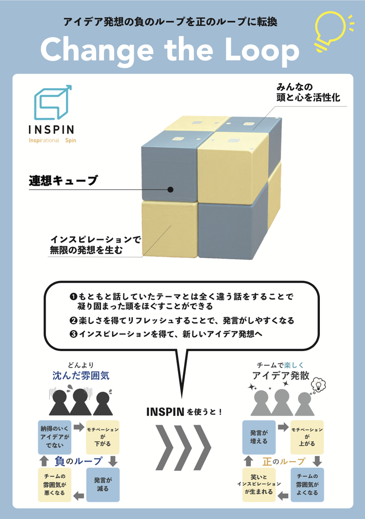Mono-Coto Innovationで凸版印刷さんと共同で制作した、アイデア発想プロダクト。 既存の強制発想法には「楽しさ」や「遊び心」が足りないという問題点に着眼し、立体的で存在感のあるキューブに言葉を貼って奇想天外な組み合わせからインスピレーションを得ることができるプロダクトにしあげた。