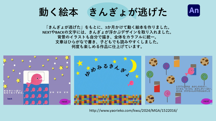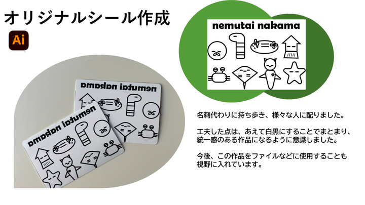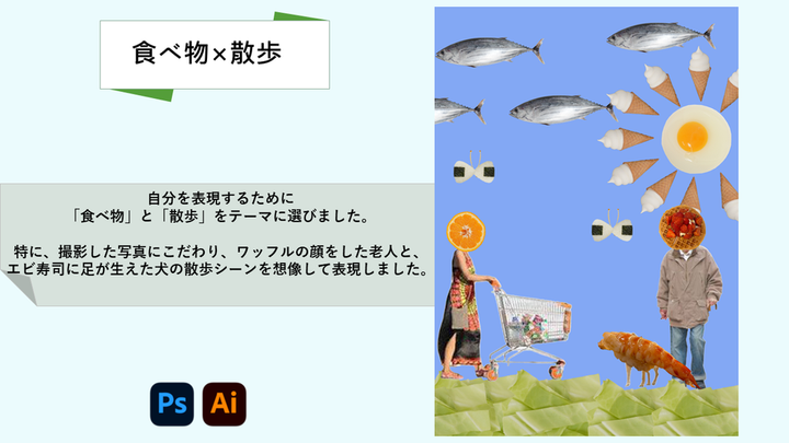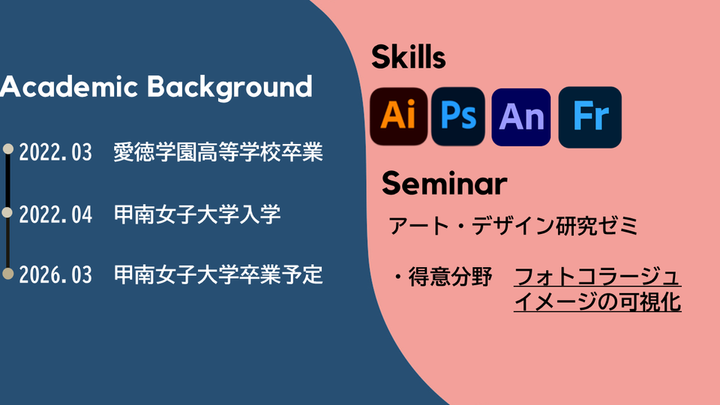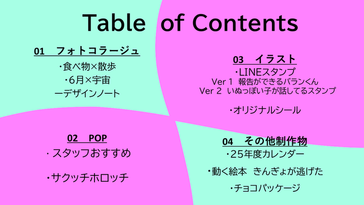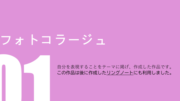 今までの自分の作品を簡単に紹介したく、ポートフォリオを作成しました。 ポートフォリオを作るのは初めてで作品数も少ないため、それぞれの作品を丁寧に伝えることを心がけました。このポートフォリオを通して私のデザインの向き合い方などが少しでも伝わりましたら幸いです。 まだ拙い作品ではありますが、何卒宜しくお願い致します。