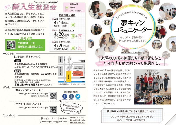 入学式時に、新入生に向けて「夢キャンコミュニケーター」の広報を行うために作成しました。 サイズ:A5 2つ折り