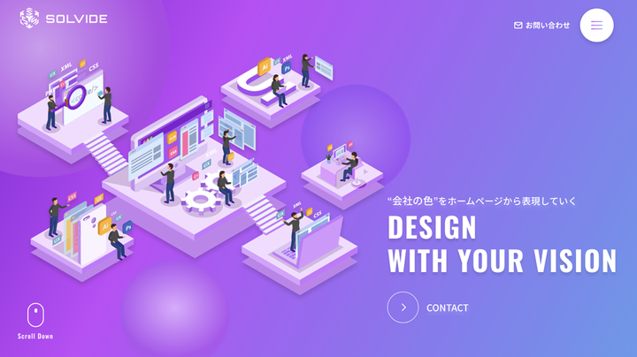 自分たちようにサイト制作の案件獲得用サイトを作りました。 XDでデザインのみ作りコーディングはできないので他の方に頼みましたが、文字サイズやニューモフィズムの部分、余白等大きく変わってしまったと思います。 ・目新しいもの+技術力の提示のために海外感、ニューモフィズム、3D感、紫色など採用しました。 まだほぼ独学の状態で作ったデザインなので課題が多く残っております。 結局サイト制作活動は頓挫し、サイトだけ残っている状態です。