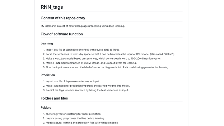 インターンシップにて作成した、日本語文章へのタグ付けプログラム。PythonのMeCab、gensim、keras、tensorflowなどのライブラリを利用。