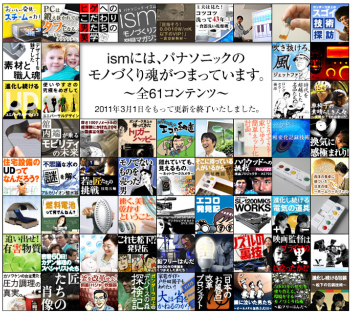 パナソニックの技術や製品の開発に賭ける社員たちの情熱や技術力=モノづくりスピリッツを、読み物、漫画、動画など多様なスタイルでWebコンテンツ課した、オウンドWebマガジン。2002年から2011年まで61コンテンツを制作発表。プロジェクトの企画立案から編集長としてネタと表現スタイルと制作チームの選定、編集とクリエイティブディレクションを担当。