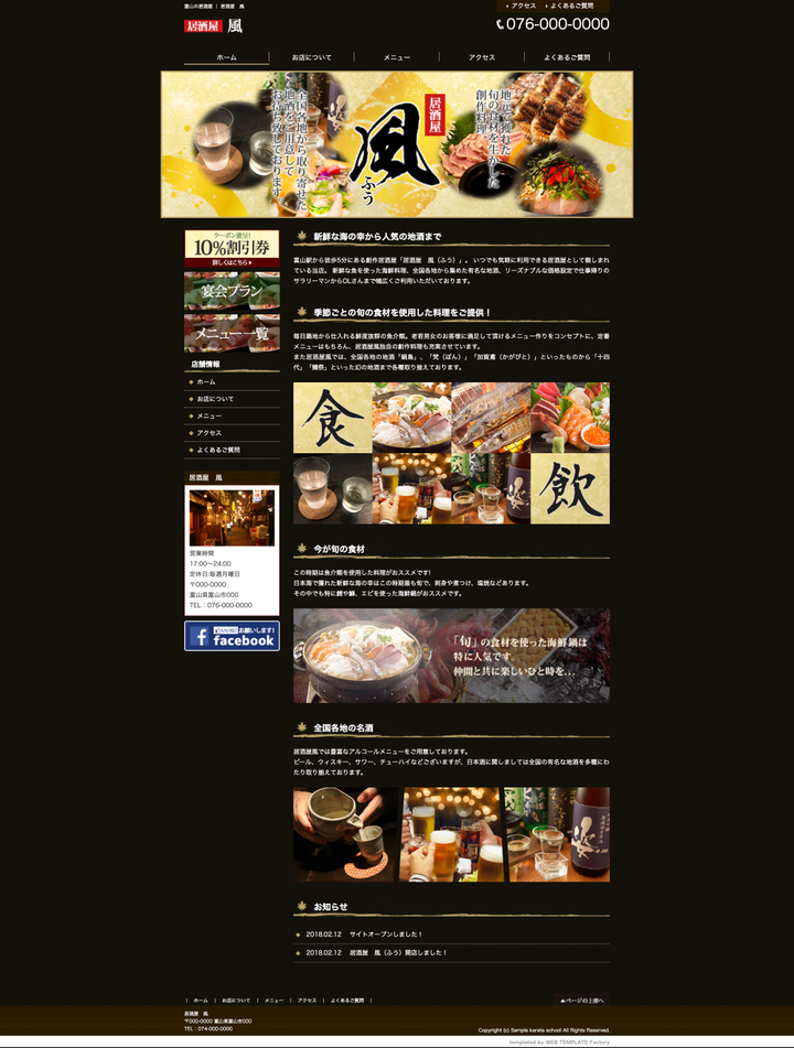 こちらの作品は、架空の居酒屋のサイトになります。 制作するにあたり、居酒屋のサイトを色々とリサーチしていく中で、居酒屋のサイト自体少ないという事を知りました。 それはなぜかというと、グルナビや食べログといったグルメサイトで必要な情報は得られるからです。 その中で、居酒屋のサイトを制作するにあたり、工夫したポイントがいくつかあります。 それは、画像をたくさん使い、このお店に行ってみたいと思えるようなワクワクするようなサイトにしようと思ったことと、トップページに視線の誘導を意識して、サイドバーに10%割引券や宴会プランと行った様々な要素を配置し、このサイトを利用した方がサイト内にどのような要素があるのかを把握しやすくした事です。