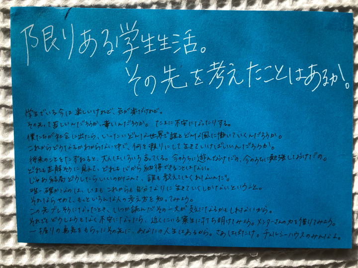 住んでいた学生寮にて、4000冊程度の本の管理をしていました。これは、キャリアについての本を集めて棚を作った際、寮生の目を引けるよう作ったキャッチコピーとボディーコピーです。
