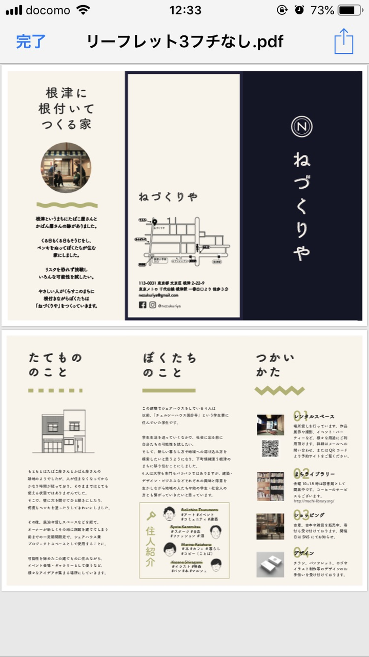 「ねづくりや」というシェアハウスのネーミングと、「根津に根付いてつくる家。」というコンセプト。そのほかリーフレットに使用した文章を作成しました。