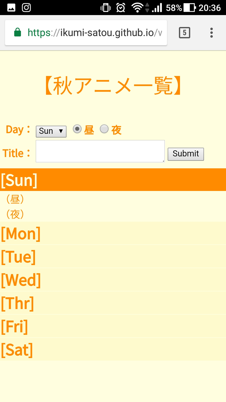 自分用のアニメ視聴リスト。 localStorageに情報を保存しているので、ページを更新してもリストは残る。 季節によってタイトルの春夏秋冬が切り替わり、CSSもそれぞれの季節で切り替わる。
