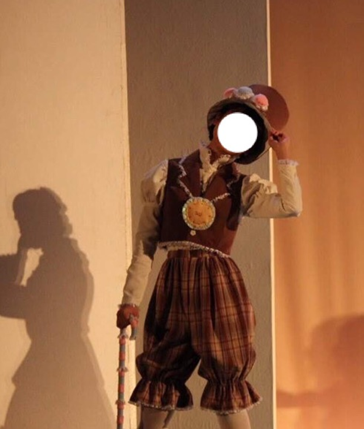 高校三年生の卒業制作展のファッションショーのために作成した衣装です。 おとぎの国のヘンゼルとグレーテルのヘンゼルをイメージして作りました。ベストの襟はテーラードカラーになっており帽子などにマカロンを付けてヘンゼルを意識しました。