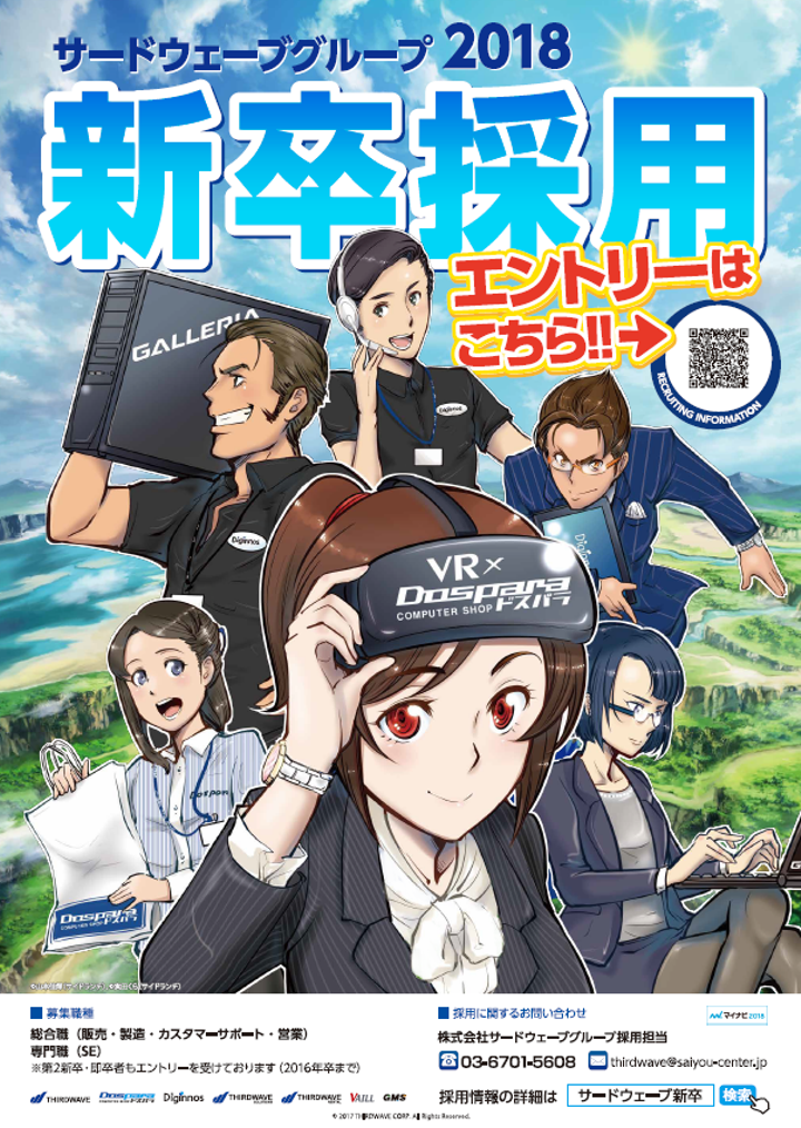 デザイン、構成を0(ゼロ)から考え、つくりました。 当社の取扱う製品(PCやVRなど)や、今回募集する職種(販売、営業、製造、CS、SE職)を、キャラクターのイメージとして表現しました。 背景はVR(Virtual Reality)をイメージした仮想世界です。 昨年、会社のお店ではじめてVRを体験しました。そのときの感動と驚きは忘れられません。 ※無料のVR体験会をやっているので、ご興味ある方は下記まで。 http://www.dospara.co.jp/5info/cts_vr_paradise-yoyaku