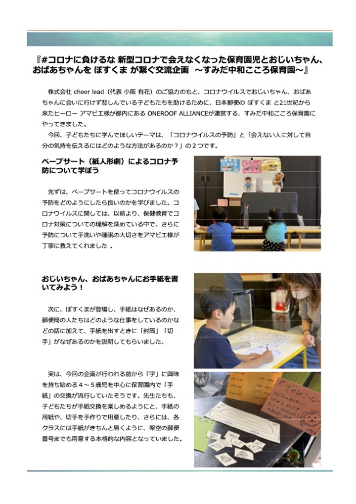 直接会えないときだからこそ気持ちを伝えるためのツールの代表である「手紙」を通じて人と人を繋ぐプロジェクトを企画・提案・実施。 第一弾はデジタルツールを使って「アマビエチャレンジ」の4コマまんがをUGCで。第二弾は日本郵便のキャラクター「ぽすくま」を使ってペープサート授業、そしてお爺ちゃんお婆ちゃんと子どもたちをつなぐリアルイベントを都内保育園数カ所にて実施。