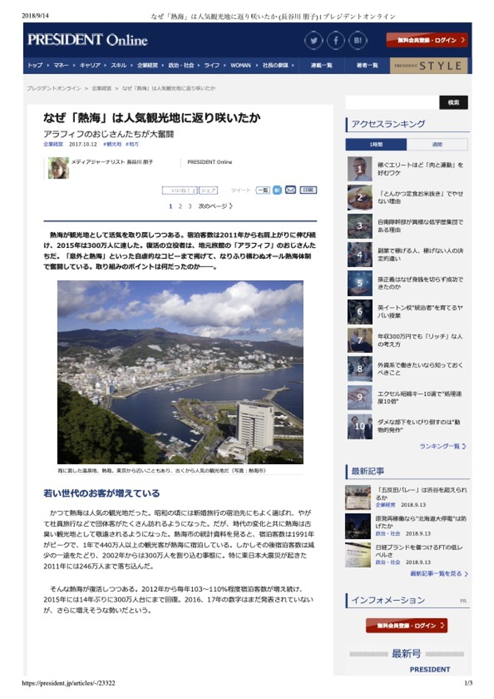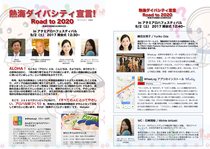 熱海市制80周年記念事業の一環として、「熱海海上花火大会 公式プロモーションビデオ」の企画・提案・実施。 公式ビデオとしては世界初で花火にドローンを突っ込ませる迫力在る映像を作成。 また、一連の流れとして「熱海ハワイアンフェスティバル」のオープニングとして、熱海市長、熱海市観光協会 理事長、熱海温泉ホテル旅館協同組合 を巻き込んでの「熱海ダイバシティ宣言」を行う。 釣りドルの石崎理絵(みっちぃ)、熱海公式ゆるキャラ あつお、そして、ダイバシティ宣言では車椅子Walkerで新開発されたばかりの「ウィーログ」を紹介と寄付金贈呈。 これら一式を終結させてダイアモンドオンラインにて取材を敢行、Yahoo!トップニュースに掲載される。 0から10までの一気通貫プロジェクトの企画・運営・実施を担当しました。 #地方創生