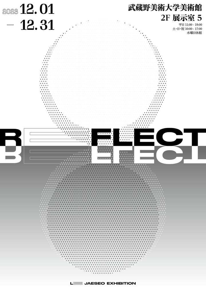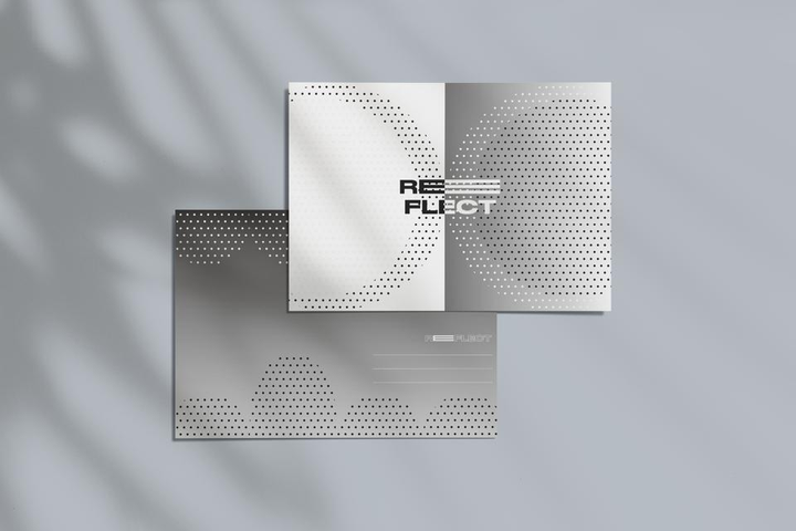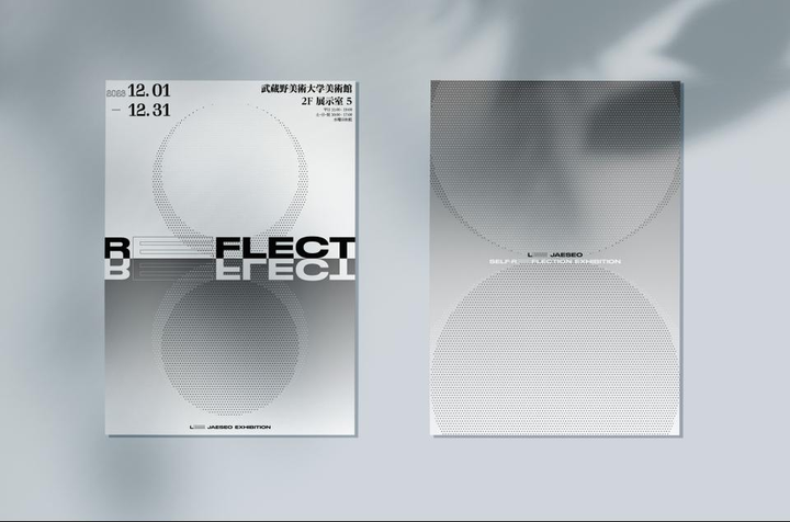 自分の仮想の展示会を企画し、ポスター、ハガキをデザインしました。「自己反省展示」をテーマにしており、展示タイトルは「REFLECT」です。