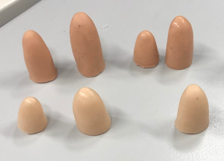 ロボットをより人に親しみやすいものにするためにヒトらしい見た目について探求します。作品はロボットハンド用のグローブの指先部分の試作です。
