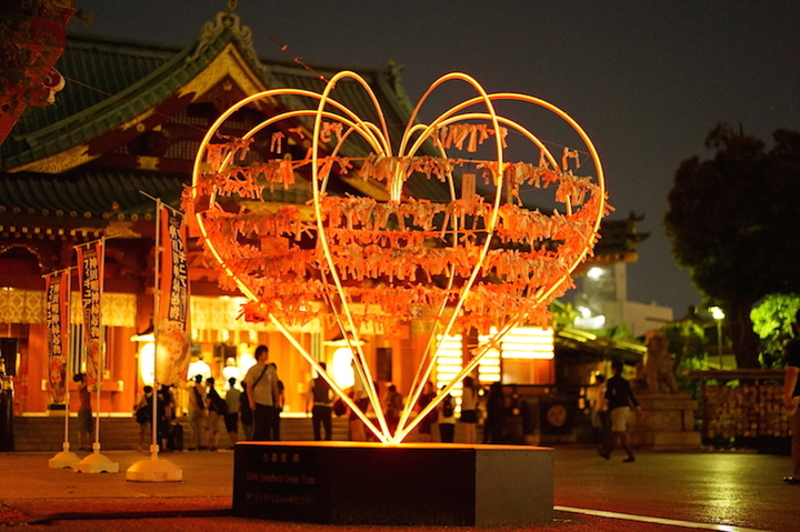HISでの業務がコロナウイルスの影響で約半年間休業に。その間、紹介で知り合った音環境デザイン・空間デザインを専門にする会社でお手伝いをした。ホテルのアートディレクション、京友禅のデジタルプリントなど、幅広い世界に触れる。写真は同社が関わった作品のひとつ「神田明神の縁結びハートフレーム」