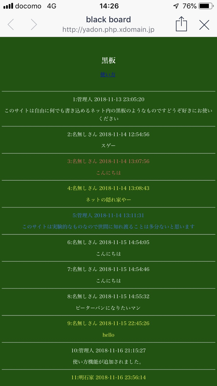 一番初めに立ち上げたwebサイトで超簡単掲示板ですphpの勉強のために立ち上げたものです。