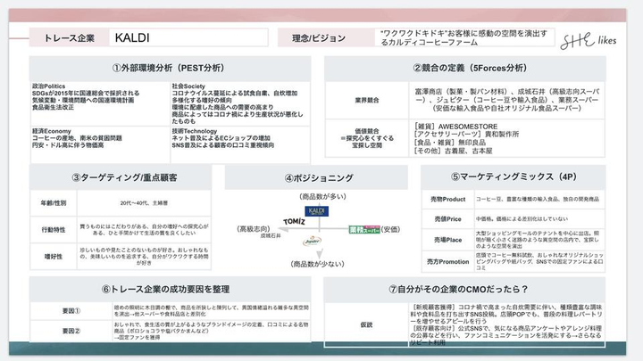 SHElikesのWebマーケティングコースで行なった、課題のマーケティングトレースです。 KALDIを題材として、PEST分析、5Forces分析、ターゲティング、ポジショニング、マーケティングミックスを行いました。
