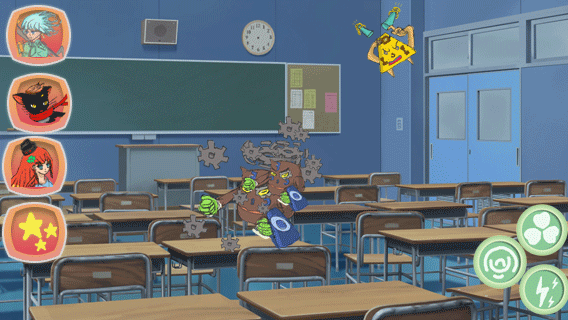 教室を舞台と想定されたバトルゲームのUIデザインです。Photoshopで作成されています。