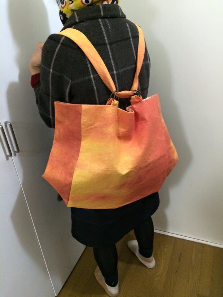 オーラソーマをしている友人がケースが大きすぎて、普通のバックだと入らないという事で制作しました。 夕焼け色に布を染めて、簡単に背負える物ができました。