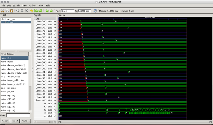 実際のソフトウェア開発には、ソフトウェアの開発経験だけでなく、ハードウェアでの開発も大切だと考えています。 verilog HDLを用いて限定的な命令セットではありますが、プロセッサの設計を行いました。そのプロセッサをシミュレーションを用いて動作させ、C言語を用いて設計した素数判定プログラムをより高速に動作できるような実験を行いました。 この開発でメモリの管理や実行の順序などハードウェアの処理を深く理解することができました。この開発で工夫した点は、より高速にプログラムが動作できるようにパイプライン処理を導入したことです。パイプライン処理を行うことで計算機の処理を無駄なく動かすことができました。シミュレーションを行い、大きく実行時間を減らすことができました。 この写真はシュミレーションをおこなった時のCPUクロックの波形を示しています。実際に100までの素数の判定のプログラムを動作させ、r2の部分での出力(25)を得ることができました。