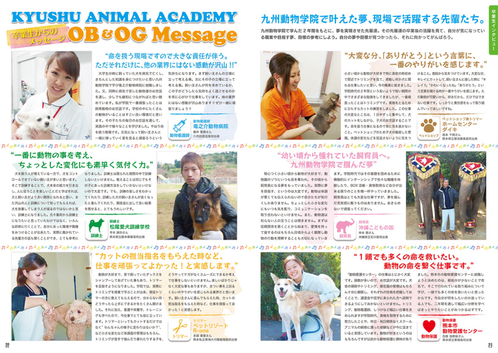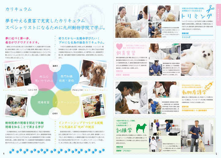 熊本にある九州動物学院様の学校案内のパンフレットになります。 作成にあたり、構成・写真撮影・デザイン制作・印刷まで一貫して担当させていただきました。