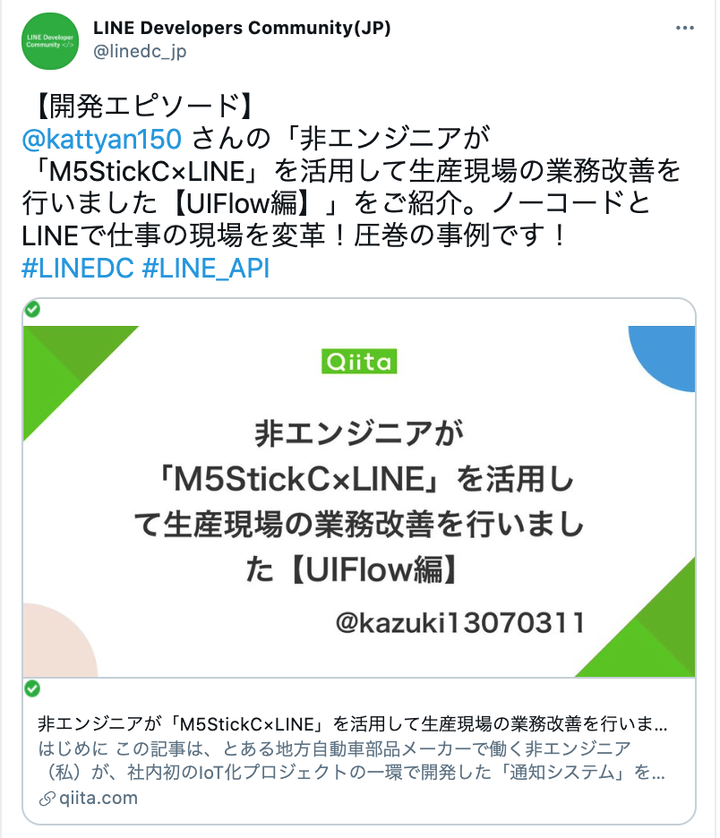 【Qiita記事】「M5StickC×LINE」を活用して生産現場の業務改善を行いました