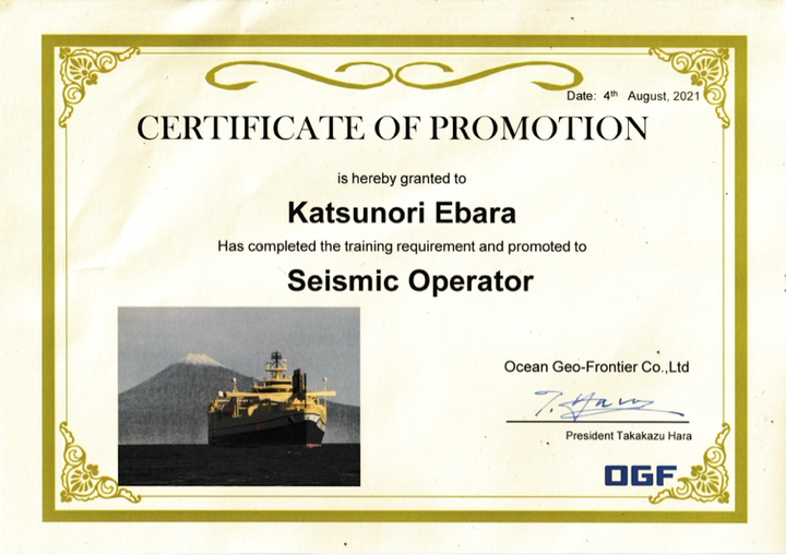オブザーバー・トレイニー(仮平社員・見習い)からオブザーバー(平社員)に、 「たんさ」船上調査員の中では初めての昇進。