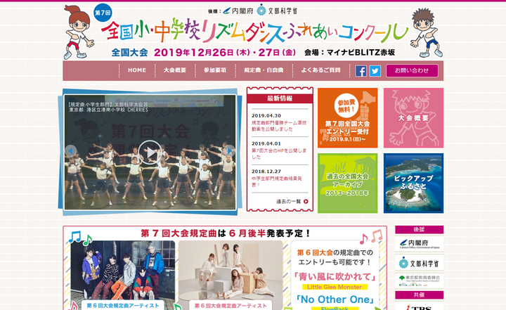 全国小・中学校リズムダンスふれあいコンクールのWebサイトの構築を行いました。使用言語はHTML, CSS, jQuery, PHPを使用しWordPressを利用して制作を行いました。Webサイトの提案からWebの構築、ドメイン・サーバーの契約、公開までを行いました。また全国小・中学校リズムダンスふれあいコンクールの開催日には、ライブ放送をWebサイトに埋め込むなど開催に合わせた修正なども行いました。