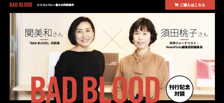 インタビューや対談の記事を書いています。こちらは『BAD BLOOD−シリコンバレー最大の捏造スキャンダル 全真相』(集英社)の刊行記念として、共訳者のひとりである関美和さんと科学ジャーナリストの須田桃子さんが対談したものです。取材と記事執筆を担当。