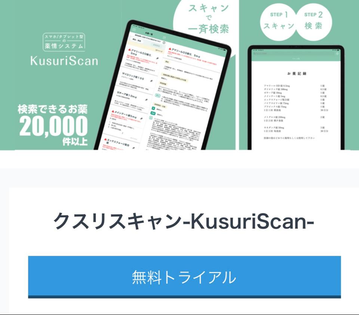 プロダクトリリース 【ただいま、14日間定期購読無料】 手軽さと使い勝手を追求し、 どこでもサッと使えるお薬検索システム クスリスキャン-KusuriScan-