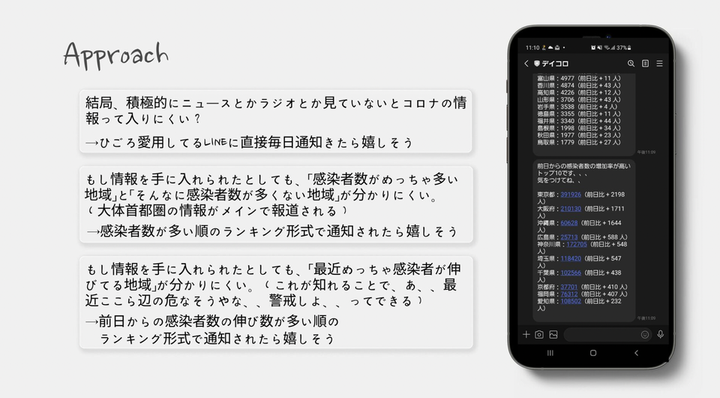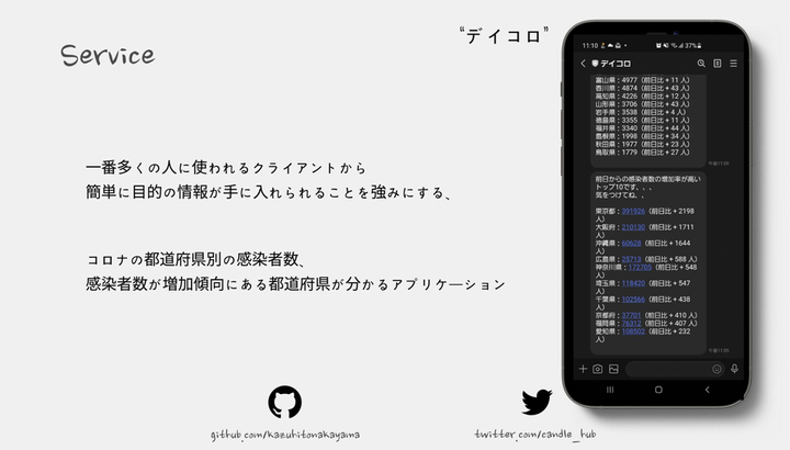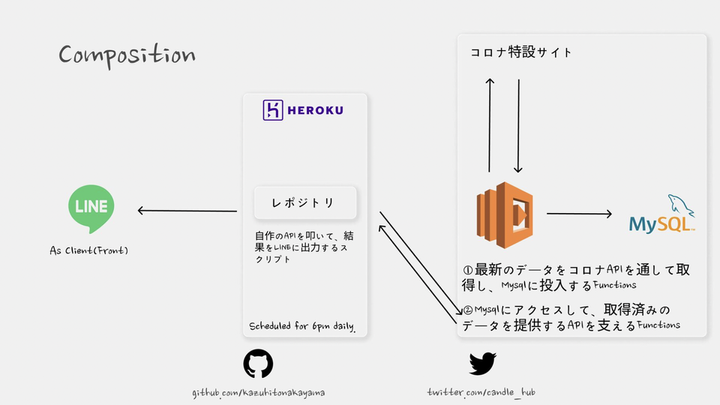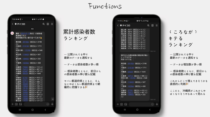 コロナの感染者数をLINEに日次で通知するアプリを開発しました。 言語としてはGoを使用し、 DBにはMysql、 インフラとして、AWS SAM・Herokuを使用しました。 課題感としては、積極的にニュースを見ないとあまりコロナの感染者数などの情報を見ようとしないなと個人的に感じていて、日頃よく使うLINEに、新規感染者数の通知や感染者数の多い都市のランキングなどが簡潔に通知されるととてもいいなと思って開発しました!