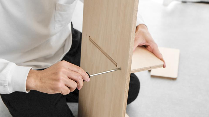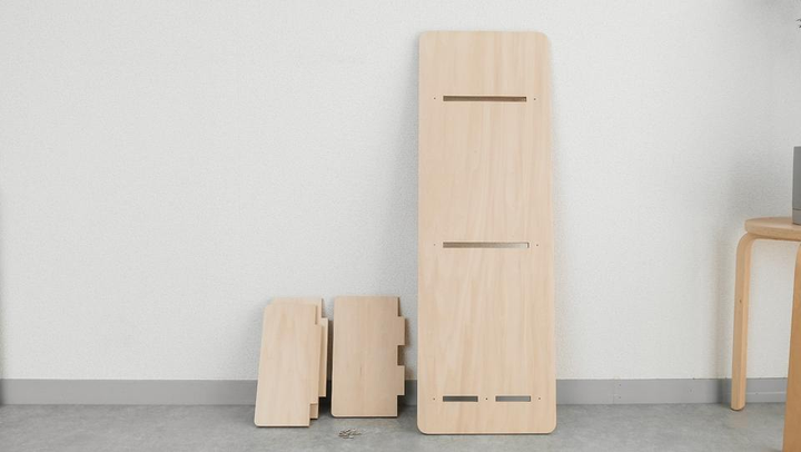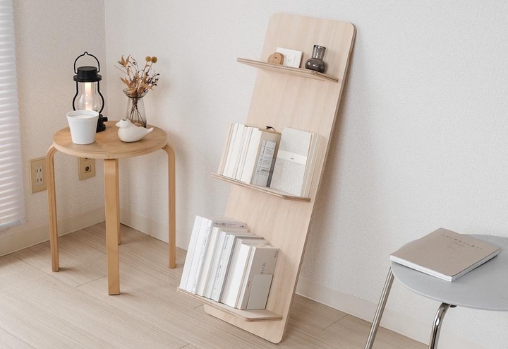 MINIMAL BOOK SHELFは最小限の要素で構成された「壁に立てかける棚」です。 狭い部屋でも軽やかに暮らしたい、配線類を隠す存在が欲しい、こだわりの本が映える本棚が欲しい。そんなモヤモヤを解決する、コンパクトな一人暮らしを楽しむ為の家具です。 Design : Kazuki Ueda Client : Self Material : Birch Plywood