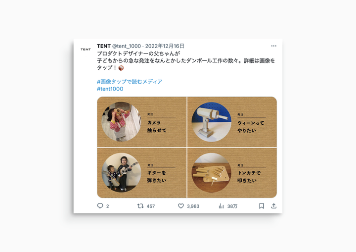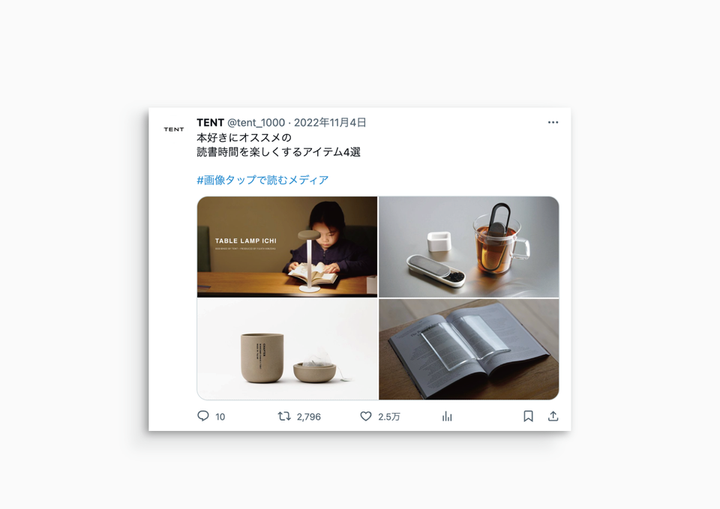 【SNSコンテンツの企画運営】 自社商品の紹介や、書籍の要約をSNS上で楽しく伝えるコンテンツとして「#画像タップで読むメディア」を企画・運営しました。画像を4枚添付すると中心を16:9でサムネイル表示するTwitterの機能を活用することで、一目でコンテンツに興味が湧くような仕組みになっています。 クライアント:クリエイティブユニットTENT様 運営期間:2022年8月〜2023年11月 Twitterフォロワー推移:1,695人 → 19,141人 Twitter投稿数:78回