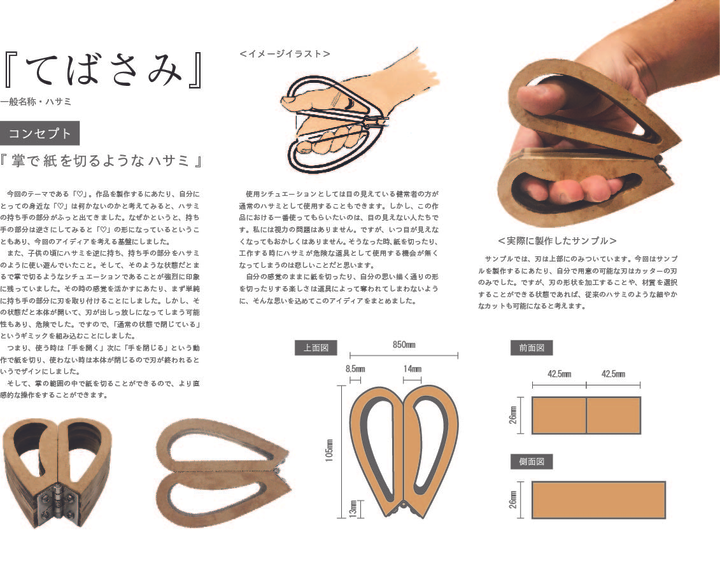 テーマは『♡』。私は普段使っているハサミの持ち手が安直であるが形が似てる。と思い、新しいハサミの形を考えてみました。本来、デザイン画だけで良かったのですが、実際に作るのが楽しいですし、再現することができるのかわかるで、プロトタイプも制作しました。 使いごごちは手で切っているような感覚です。刃の位置が手の範囲内なので目の見えない方でもサクサク切れます。