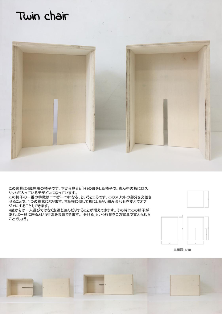 授業で製作した子供向け家具です。 すこし捻りを加えたデザインにしています。