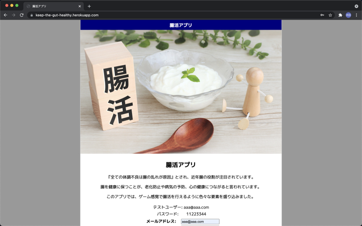 ■コンセプト ゲーム感覚で腸活を行うアプリ ■作成したきっかけ 『全ての体調不良は腸によるもの』と言われ、腸の働きが注目されています。 健康に良いものを食べることを腸活と巷では言われていますが、腸の流れが悪く 吸収ができなければ意味がありません。 腸活のポイントを押さえ、楽しんで行えるアプリを開発しました。 ■重視した点 ユーザーがPDCAを繰り返し、自分の食生活を客観視できるように 計画を立て、実績を入力し、フィードバックを行える点。 カレンダー表示、グラフ表示で過去の自分の傾向を見ることで、対策を立てることができる点を重視しました。 ■取り入れた技術 ・Java, servlet & jsp, HTML, css, javascript, jQuery, My SQL,Heroku ■Github https://github.com/Keijiro-Ida/the-gut-health