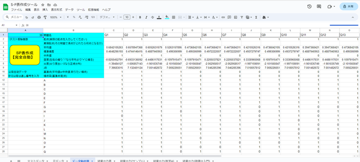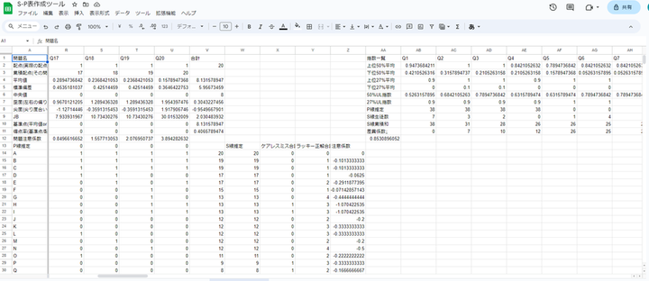 大学で、教職課程も履修しており、教育実践演習という講義で「教師の活動で興味のあるテーマを調査して、レポートにまとめる」という課題があり、自分が教育実習に行った際の小テストの出題方法が妥当であったかを推定する分析手法を調査し、実際に値を解析しました。そのような分析手法を、統計学やプログラミング力のない方でも、実施できたら教育効果が向上すると思い、インターンシップで習得したGASを用いて作成しました。 ツールの概要としては、定期テストや小テストを作成した際に、生徒の成績だけでなく、出題の仕方に問題がなかったかを振り返るための自動分析ツールです。 具体的には、問題ごとの平均点・標準偏差・中央値のみでなく、ジャックベラ検定を活用して平均点or中央値を活用した「基準点」の設定、UL指数(上位生徒と下位生徒の出来の差)、差異係数(試験全体を通して差がつくテストであったか)、クロンバックのα係数(テストの信頼性(何回実施しても同じレベルの生徒が受験すれば似たような結果になるか))を自動で算出する。 多くの方に使用してもらえるように、「テストデータを入力する」及び「ボタンを押す(というトリガーの設定ができる)」GASを、共有のしやすさも考慮して選択しました。 また、教育現場ではソフトをPCにダウンロードできないというケースもあるとのことでしたので、多くの方が持っているGoogleアカウントで共有でき、実行も容易にできるGASを採用しました。