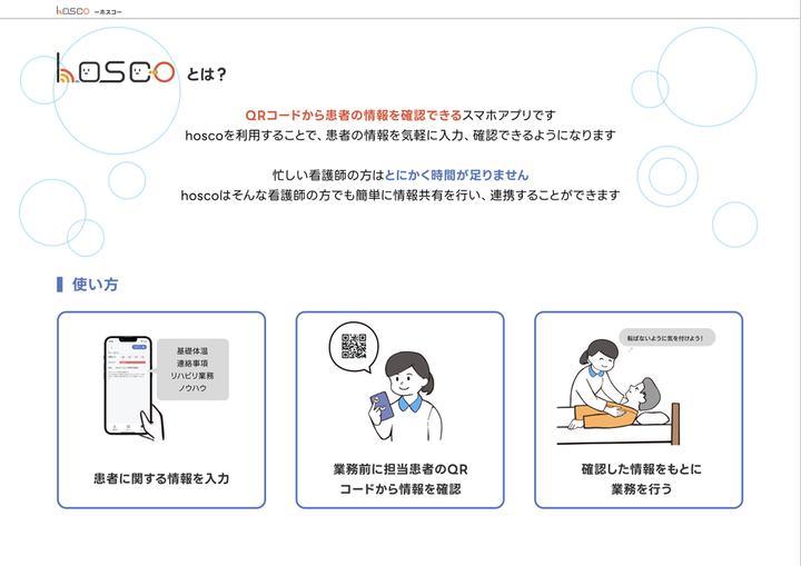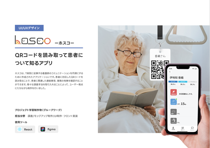 「病院におけるDXをデザインする」というプロジェクトにおいて、医療従事者の情報共有をDXし、いつでもどこでも情報共有が可能にするため、QRコードを読み取ることで患者情報に簡単にアクセスできるスマホアプリ「hosco」の作成、提案を行いました。 担当分野:デザインリサーチの手法策定、実行、デザイン業務全般(UIデザイン、グラフィックデザイン、プロダクトデザイン)、病院に対するプレゼン ※より詳しく知りたい方は下記のリンクからご覧ください。